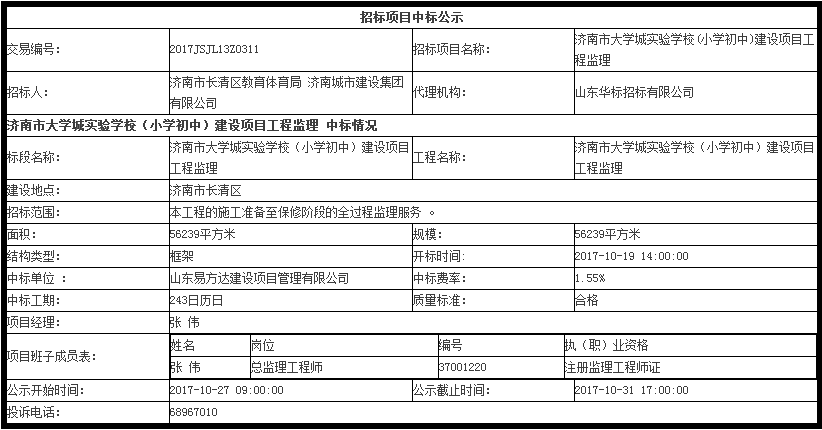 济南市大学城实验学校(小学初中)建设项目工程监理中标公示