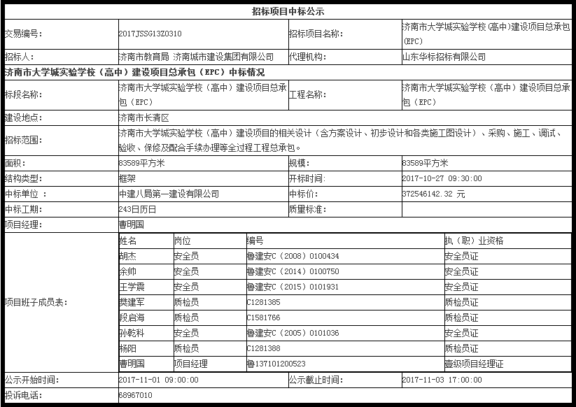济南市大学城实验学校(高中)建设项目总承包(EPC)中标公示