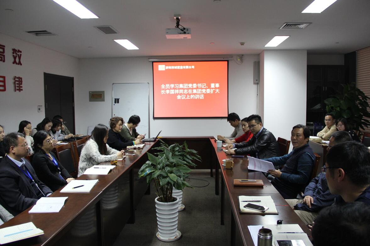 2017年11月15日下午,济南西城置业全体员工学习集团党委书记、董事长李国祥同志在集团党委扩大会议上的讲话,落实集团党委要求,学好、学懂党的十九大精神,振奋士气,推动工作,努力完成各项任务指标,争创更佳经营业绩。