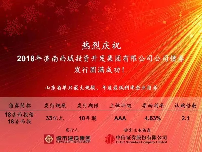 12月14日,m88明昇全资子公司济南西城投资开发集团有限公司成功发行33亿元企业债券,共有53家机构参与认购,认购倍数2.1倍,认购总额达到70亿元,发行利率4.63%,期限10年。该笔企业债券创下多项省市企业债券发行之最,是我省2018年规模最大、本年度利率最低的企业债券,同时该笔债券融资也是济南市有史以来获批最大规模、今年唯一一笔企业债券。