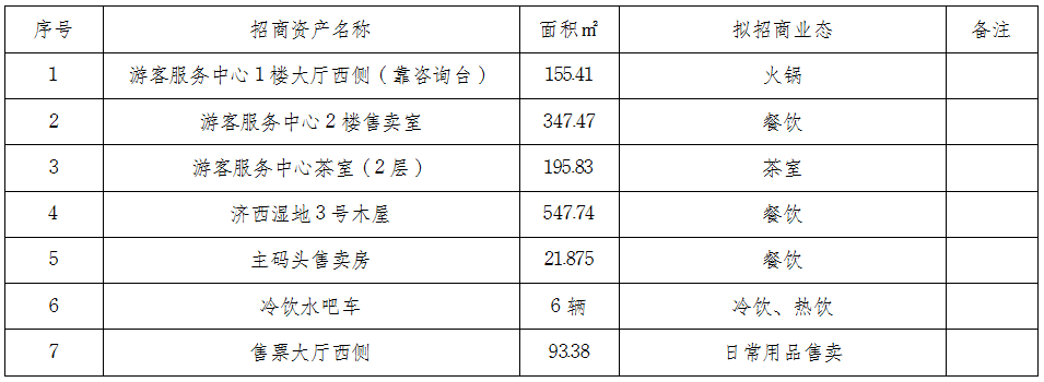 山东济西国家湿地开园在即,为丰富园区业态,现就园区可经营性资产进行公开招商,资产面积及业态规划如下: