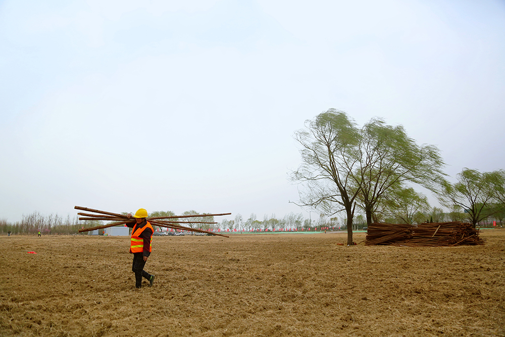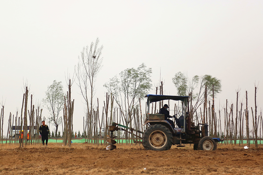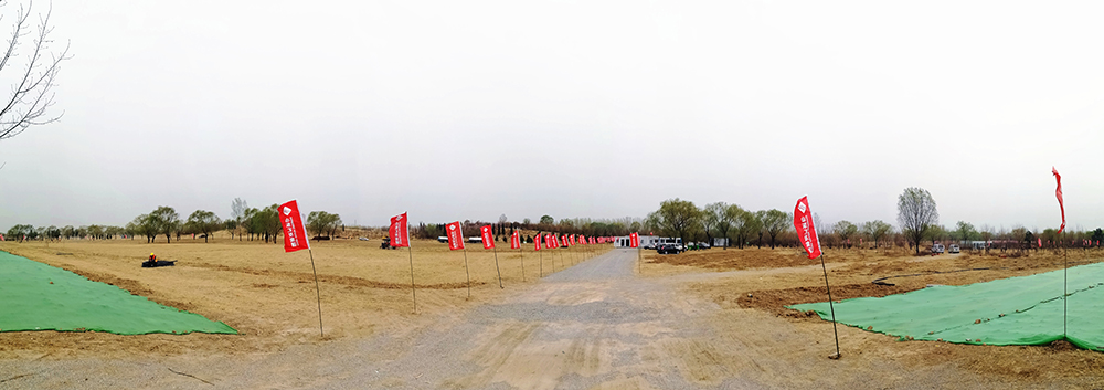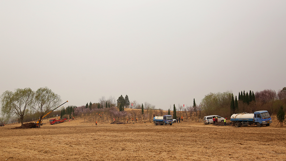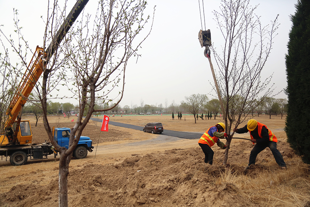 负责项目具体建设的汇友园林公司在接到工作任务后,迅速响应,3月24日全面调度,组建成立了40人的项目部,3月26日正式进场施工。截至目前,项目已搭建完成办公室、会议室、宿舍、厕所等办公配套设施,已进扬大型挖掘机5台、小型挖掘机10台、控坑机6台、旋耕梨5台、吊车3台、水车5部。在300余人施工队伍的奋力推进下,目前已整地15000平米、挖树坑12000个、栽苗1500棵。近期,计划5天内铺设管道5000米,6天挖坑30000个,10天栽苗40000棵(309北侧20米及北岸未定)。