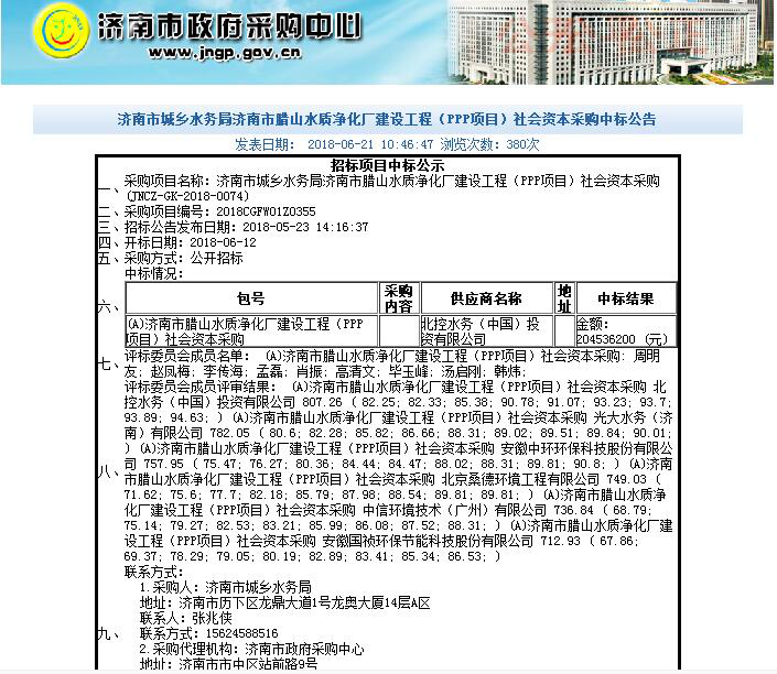 2018年6月14日-22日,按照市城乡水务局要求,资产运营公司参加腊山水质净化厂ppp项目预中标社会资本谈判会,按照政府采购中心要求与前三名中标人进行会谈,按程序最终确定成绩第一名的北控水务(中国)投资有限公司中标。21日济南市政府采购中心开始进行中标公示,22日资产运营召专题研究会,与北控水务就合作协议、公司章程相关内容与条款进行讨论,研究部署组建ppp公司相关工作,倒排工期,压茬推进各项前期工作。