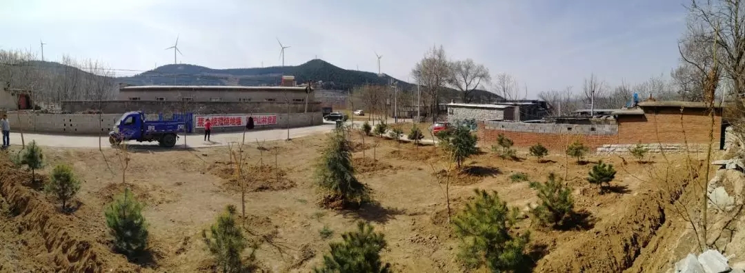 11:00王栋栋来到村里另一块裸土覆绿的空地上,村民齐上阵,植树工作已接近尾声。空地尽头的文化墙,与远山近树相映成趣。2017年,大黄崖村入选第四批省级传统村落,王栋栋到村后,结合本村实际,在不破坏古村落的基础上,在村民相对集中、显眼的位置建设墙体文化,加大扶贫政策宣传力度,传递国家政策方针,提升了村里文化气息,极大的改善了村容村貌。