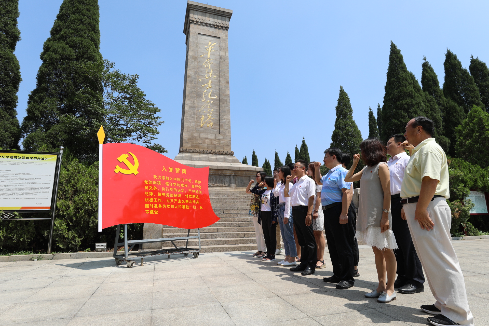 在莱芜战役史纪念馆,全体党员干部认真聆听讲解,仔细观看历史图片、资料,重温革命历史,详细了解莱芜战役的荣耀历程,深刻缅怀了革命战士不怕牺牲、浴血奋战,联合人民舍小家、顾大家、全力支前,保证莱芜战役取得胜利的革命精神。在革命烈士纪念碑下,大家郑重举起右手,重温入党誓词,重新感受入党初心。