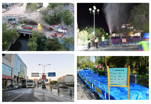 现场通过抑尘车雾炮、洒水车、清扫车连续作业,物料严密覆盖,最大程度抑制扬尘。