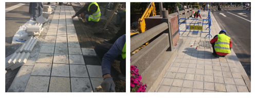 人行道花砖严格挂线施工,砂浆铺设饱满,勾缝细致。
