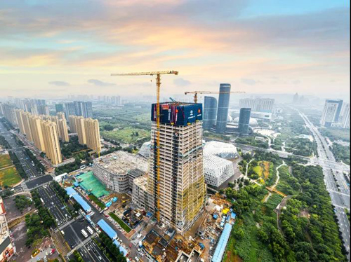 工程施工工艺复杂,包含3300t劲型钢结构、3万㎡PK预应力叠合板、预制楼梯、预应力等,主体施工技术含量高。结构外造型复杂,塔楼四面斜向内收,其中,西立面是斜折面内收,塔楼四角最大内收水平距离为10.4m,最小内收水平距离为0.7m,7-34层单层面积由2800㎡递减至1800㎡。