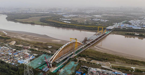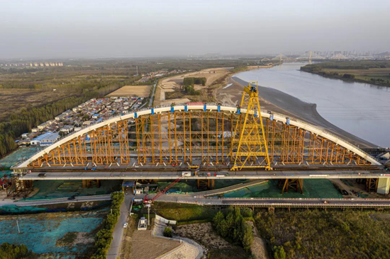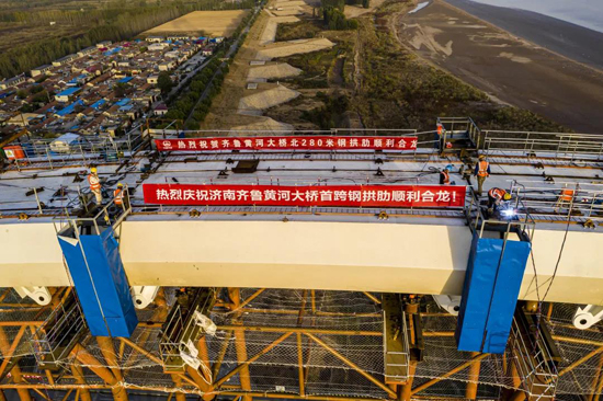 齐鲁黄河大桥是一座下承式网状吊杆拱桥,双向八车道设计中间预留轨道交通,采用公轨同层的布置形式,桥梁从设计到施工“一首三最”创造了多项世界纪录,其中网状吊杆体系为世界上首次采用的400Mpa超高应力幅拉索,主跨主拱采用三段法安装作业中间段提升跨度300m、提升重量6500t创世界第一,同时主梁宽及主跨跨度均位居同类型桥梁世界之最。本次合龙的首跨拱肋矢高46.2m,总重达3200吨,采用满堂支架法施工。
