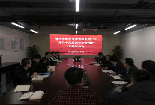 遵照m88明昇党委安排部署,为进一步学习宣传贯彻党的十九届四中全会精神,加深对全会精神的了解掌握,提高运用党的理论成果推动工作的能力,确保园区各项工作落到实处,公司于2019年12月份下旬安排三天下午,在印象济南园区会议室由总经理宋光华同志主持召开党的第十九届四中全会精神的专题学习。
