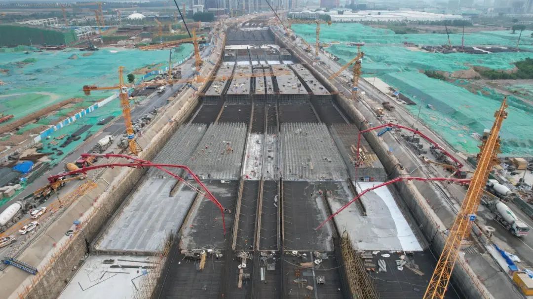 工程开工建设以来,五个工区同步平行施工,24小时饱和施工,加大人力、机械投入,高峰期间三千余人同步会战,保障工程有序推进。施工过程中,在严格执行环保标准的前提下,利用两个月的时间完成160万立方米的通道基坑土方开挖,相当于开挖两个大明湖的方量。完成钢筋制作安装8.6万吨,浇筑混凝土43.9万立方米,地面道路水稳18万吨,沥青12万吨。