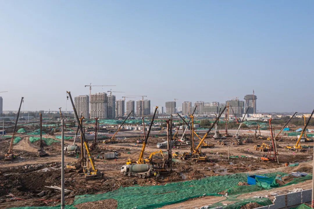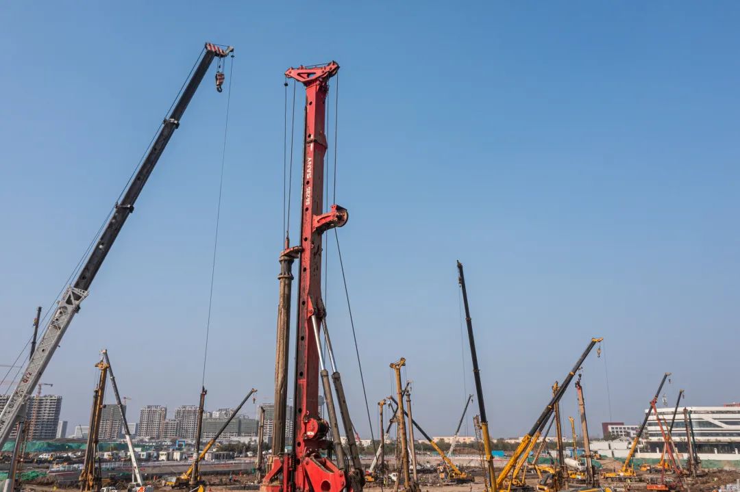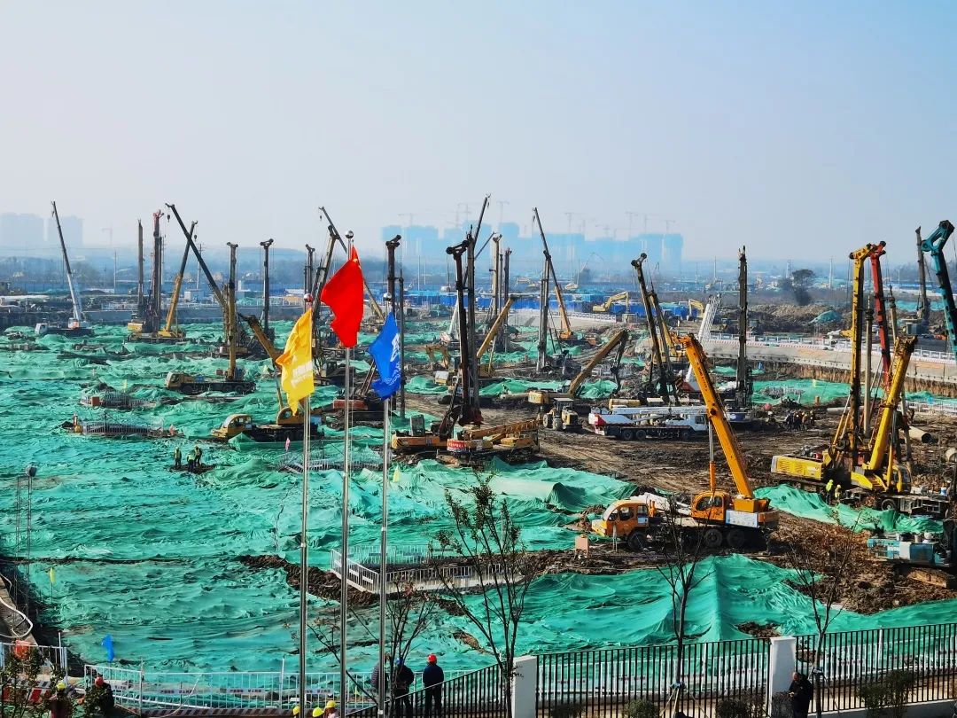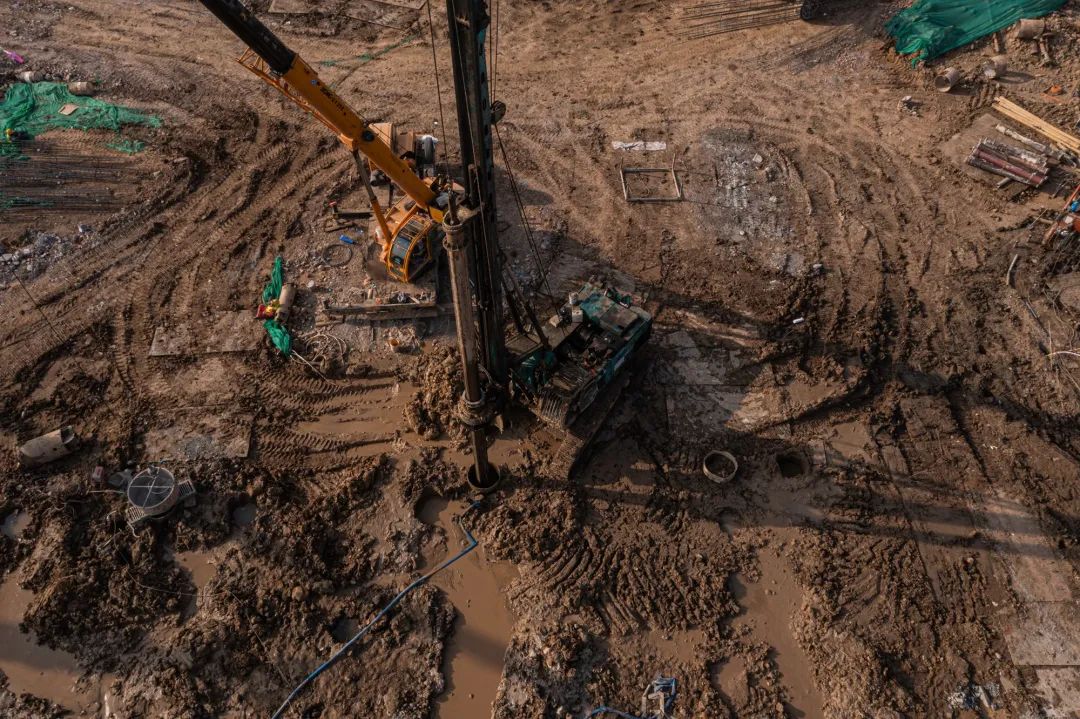 桩基施工准备阶段,根据项目情况优化编制基础工程施工组织方案,制定桩基施工布置图,按基桩类型、特点划分9个施工区域,明确基桩编号、施工顺序、基桩检测等策划内容,有效串联设计、施工、监理、检测、验收等环节。在3万平方米打桩区域,同时布置了20余台旋挖钻机、30余台汽车吊、20余台装载机,施工劳务人员300余人,投入9个施工区域24小时不间断作业。自2021年10月22日开始全面钻进,11月26日,浇筑完成最后一根桩基,山大二院项目全体人员迎难而上,酣战月余,克服暴雪、大风等恶劣天气,施工日均完成桩基80余颗,顺利完成2452颗桩基的施工,完成桩基产值约1亿元,占项目建安总投资的4.2%。完成项目建设第一个里程碑节点,实现全面进入下步土方开挖施工节点跨越。