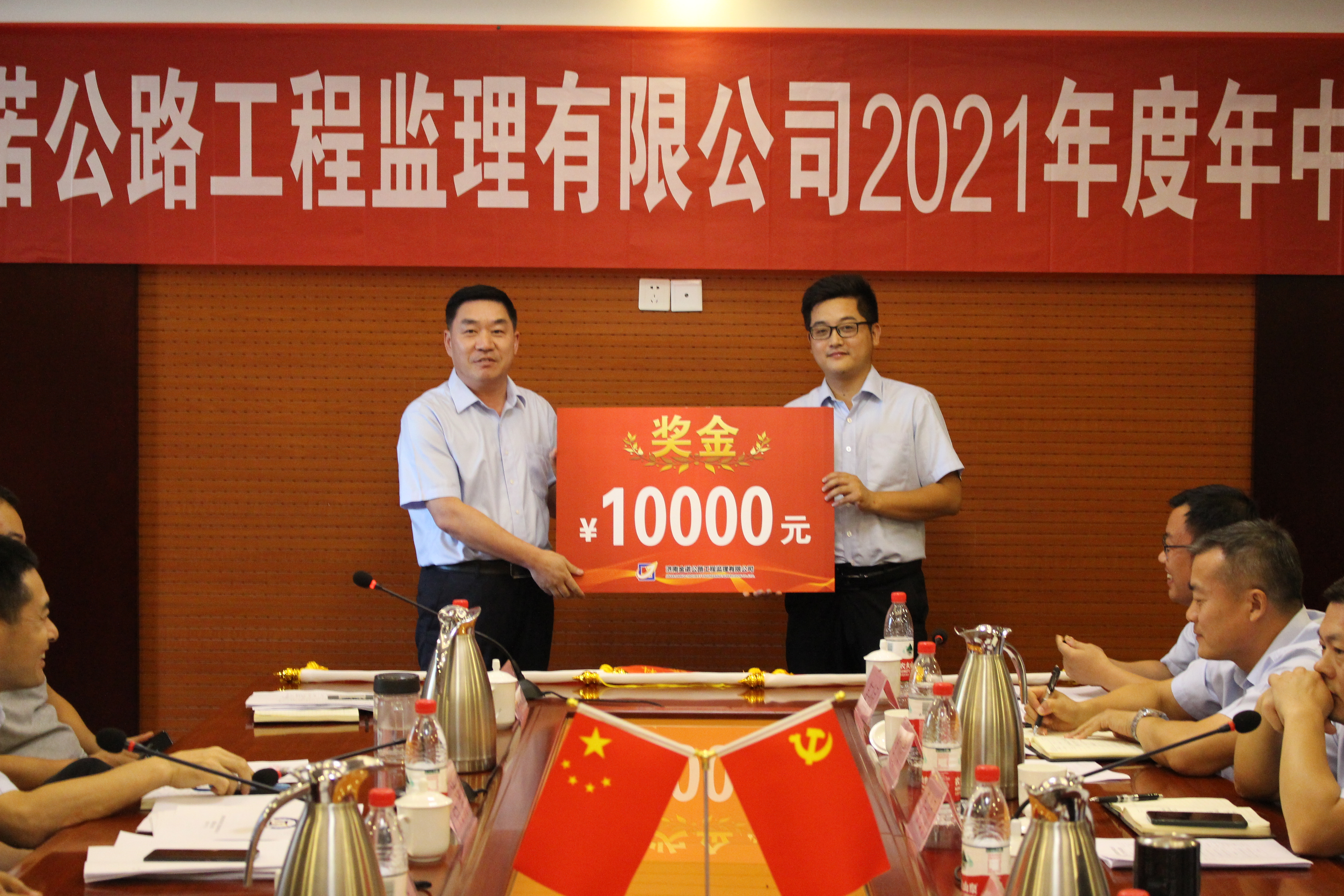韩总经理向2021年上半年检查考核中获得单项优胜奖的业务公司颁发了流动红旗,向获得综合成绩“优”的第三分公司颁发"考核优胜单位"奖牌,并向“党员先锋队”“青年突击队”“科技服务队”“志愿服务队”授旗。