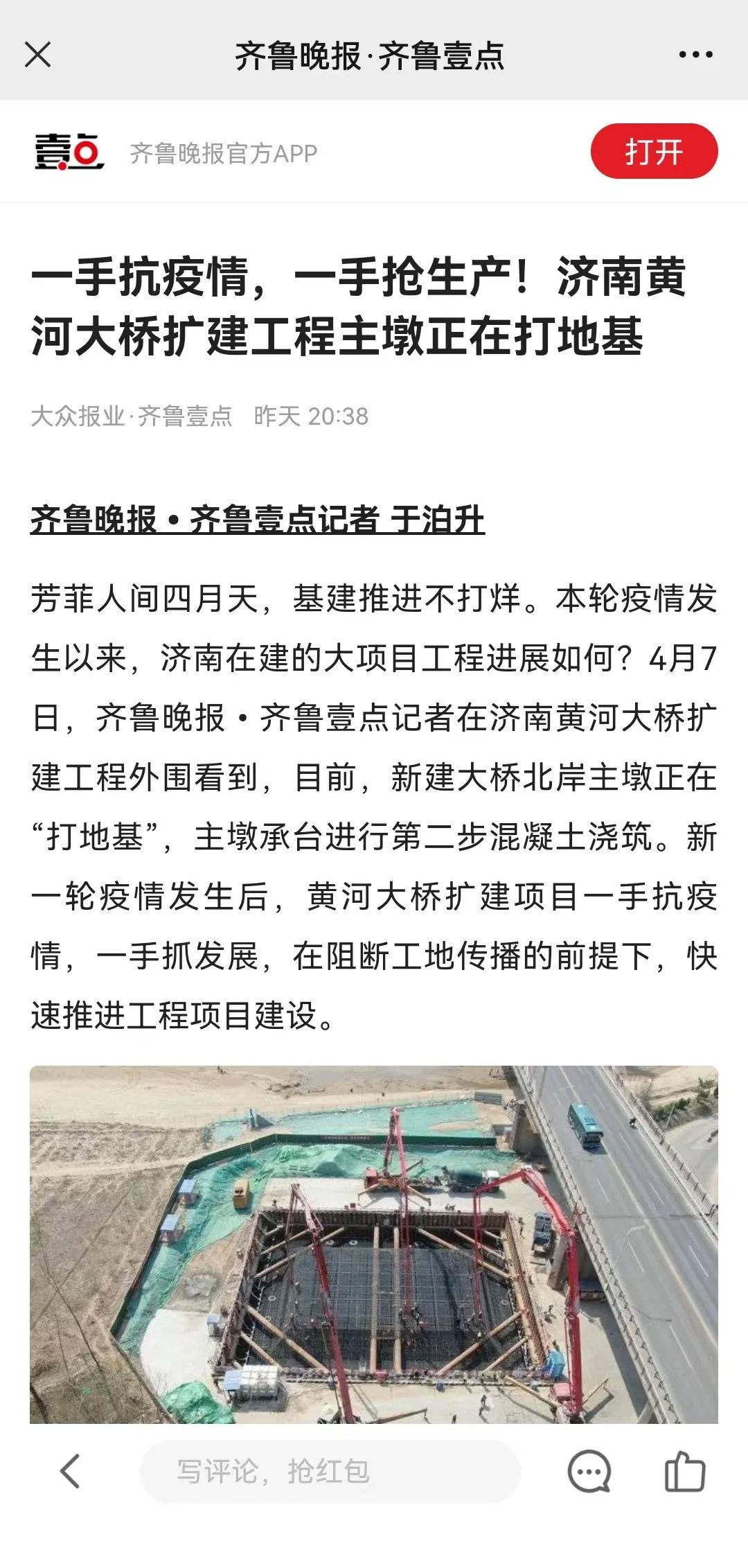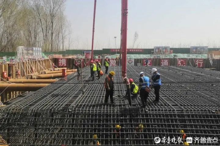 芳菲人间四月天,基建推进不打烊。本轮疫情发生以来,济南在建的大项目工程进展如何?4月7日,齐鲁晚报•齐鲁壹点记者在济南黄河大桥扩建工程外围看到,目前,新建大桥北岸主墩正在“打地基”,主墩承台进行第二步混凝土浇筑。新一轮疫情发生后,黄河大桥扩建项目一手抗疫情,一手抓发展,在阻断工地传播的前提下,快速推进工程项目建设。