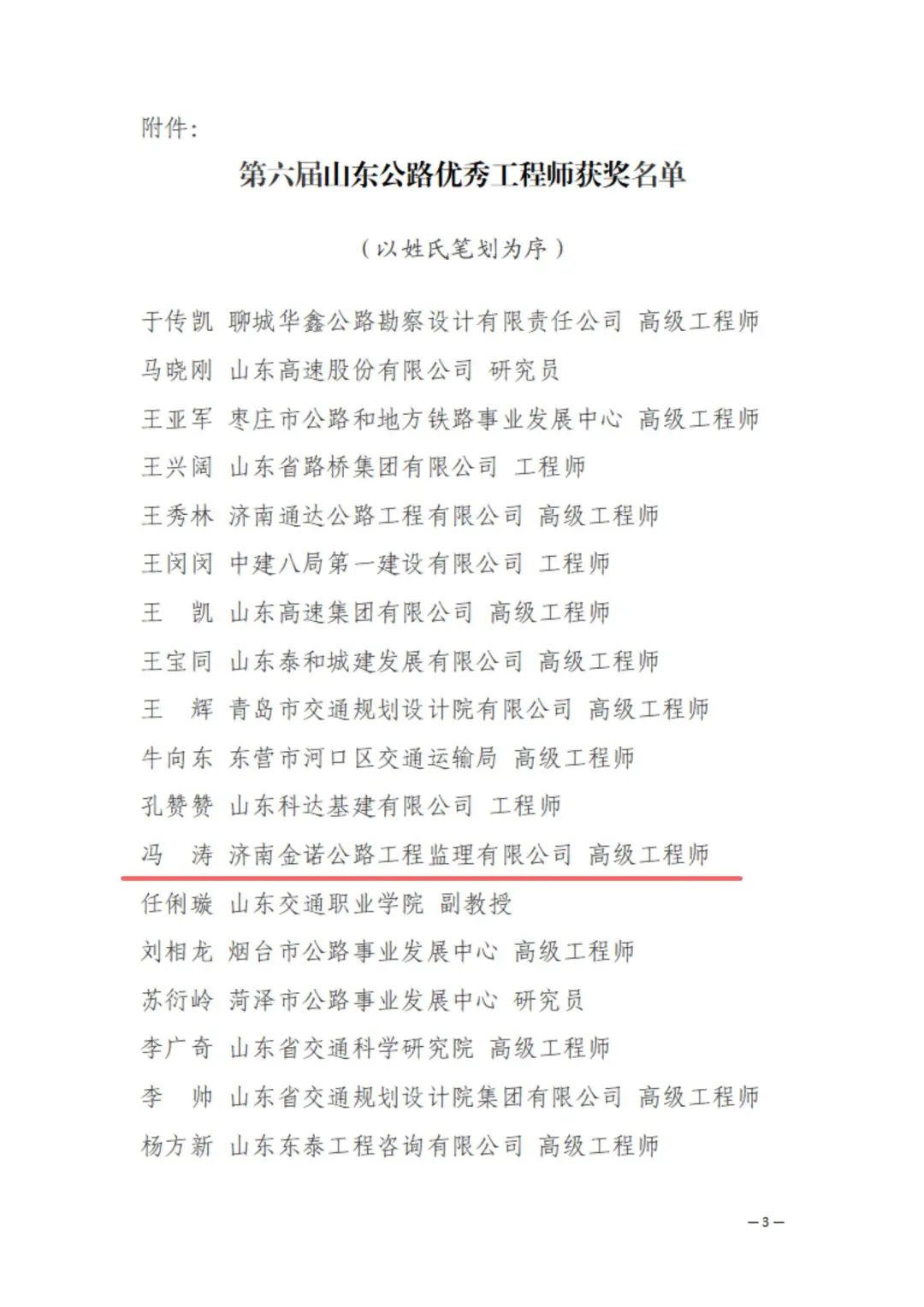 近日,山东公路学会发布《山东公路学会关于表彰第六届山东公路优秀工程师的决定》的通知,m88明昇所属济南金曰公路工程有限公司副总经理辛崇升、济南金诺公路工程监理有限公司副总经理冯涛荣获 “山东公路优秀工程师”荣誉称号。