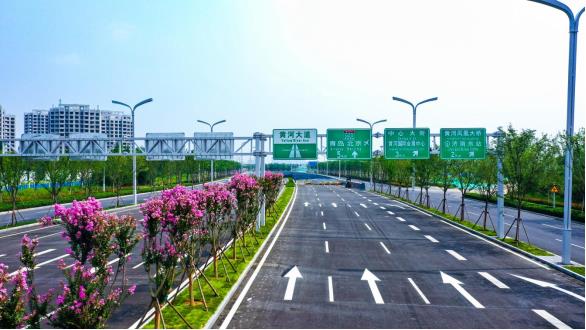 黄河大道新通车路段全线绿化面积达40余万平方米,占比高达40%,不光绿化面积大,绿化植物品类也多,营造出“四时之景各不相同”生态效果。