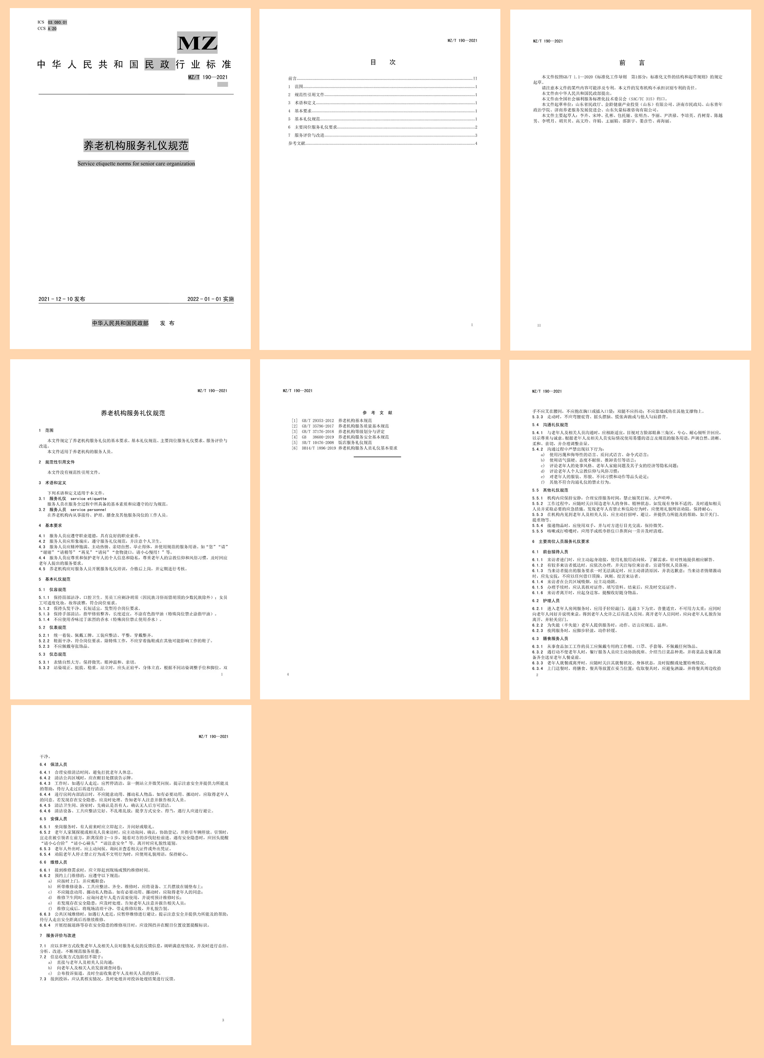 《养老机构服务礼仪规范》规定了养老机构服务礼仪的基本要求、基本礼仪规范、主要岗位服务礼仪要求、服务评价与改进,适用于所有养老机构的服务人员。