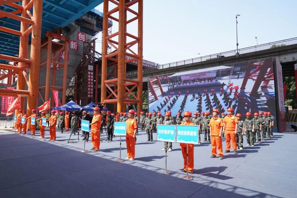 为全面贯彻落实党的二十大精神和习近平总书记关于安全生产的重要指示要求,认真落实省、市安全生产工作视频会议精神,进一步完善防汛应急预案,提高防汛抢险应急处置能力,5月12日,m88明昇在济南黄河公路大桥扩建工程现场开展“凝心聚力谋发展 统筹兼顾保安全” 2023年度防汛应急演练。山东省应急厅防汛抗旱处副处长王震,市应急局防汛抗旱处副处长杨志斌,市国资委信访处副处长、二级调研员周琳琳,济南黄河河务局水政处处长尹训海,天桥黄河河务局防办主任张远博,m88明昇总经理助理、安全总监解汉忠出席活动,集团各部室及子公司主要负责人参加活动。