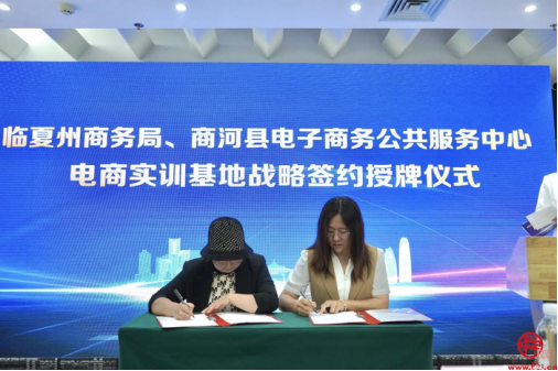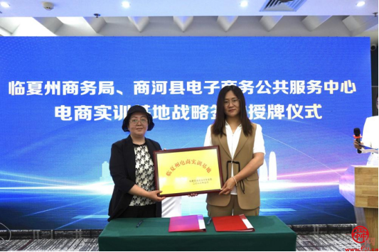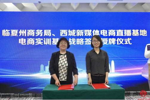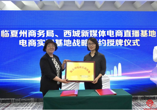 在与会人员的共同见证下,临夏州商务局与西城新媒体电商直播基地、商河商务服务中心签署了电商实训基地战略协议,并为两家电商实训基地授牌。