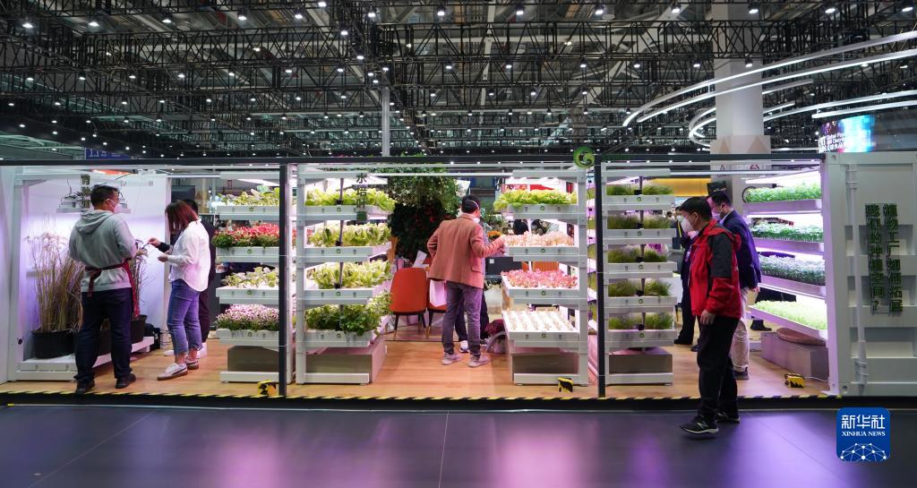 观众在第五届进博会食品及农产品展区参观集装箱植物工厂的模型(2022年11月7日摄)。新华社记者 刘颖 摄