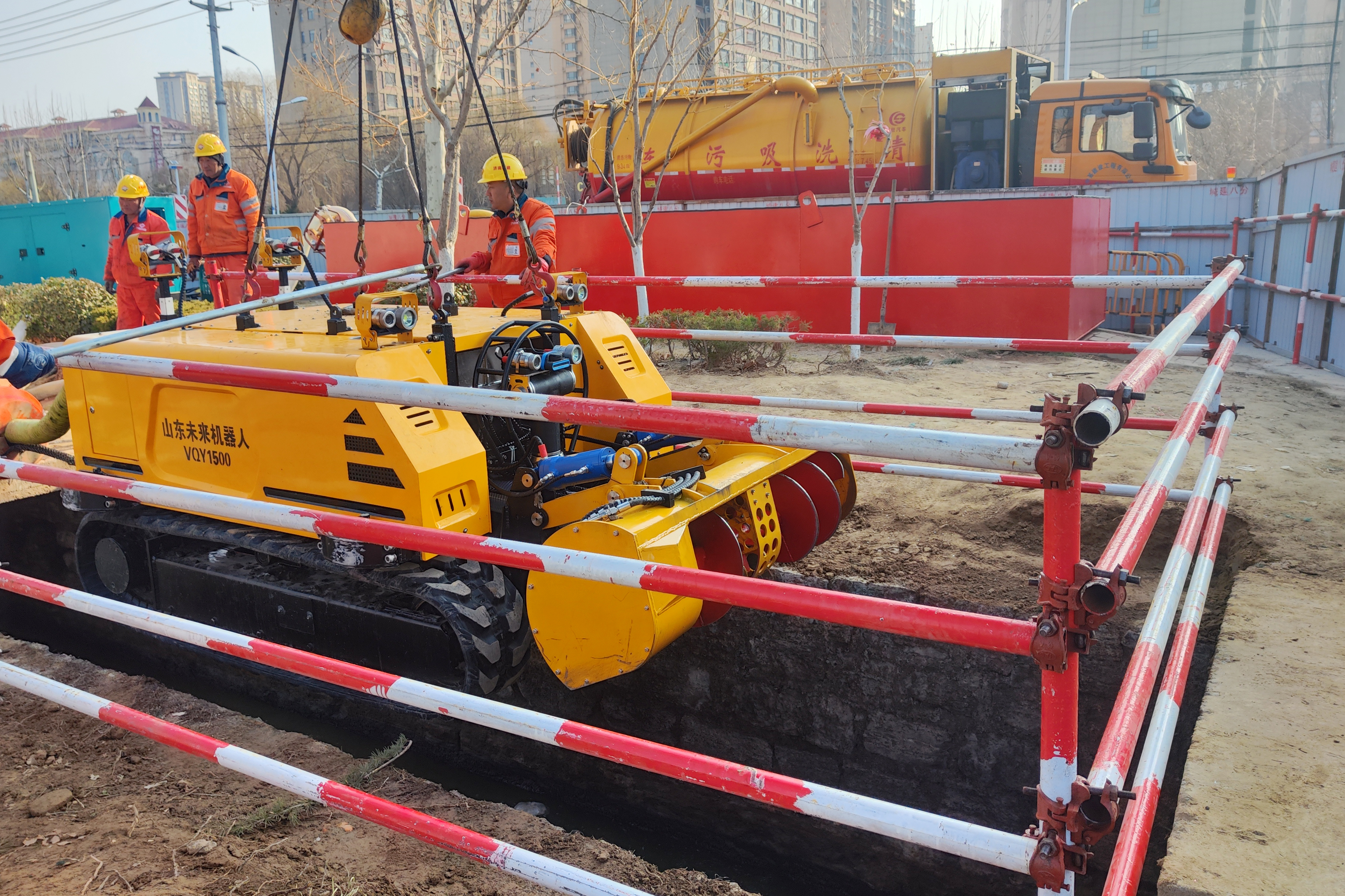 雨污分流改造是国家“十四五”城镇污水处理及资源化利用发展规划的重要内容,也是城建集团公司在城市基础设施建设领域的重点业务。城建集团公司在实施城市雨污分流改造工程中,积极开展科技创新,成功研发出水下无人清淤机器人,具备在特殊环境下代替人工进行城市河道、涵洞、暗渠等清淤作业的自动控制功能。技术人员远程遥控指挥,利用配有照明、摄像、水下成像声纳等观测设备的水下机器人实现水下作业,然后由清淤车辆把污泥运送至指定地点,完成整套清淤施工作业任务。相比于传统人工下水清淤作业,水下无人清淤机器人具有“人不下井、路不开挖、水不断流、泥不落地”技术优势,极大提升清淤效率,彻底消除人工清淤带来的安全隐患,助力城市精细化管理,提升城市水环境治理效能。