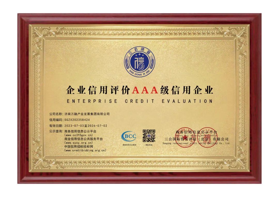 目前,公司拥有企业资信AAA等级证书、质量服务诚信企业AAA等级证书、重合同守信用企业AAA等级证书、诚信经营示范企业AAA等级证书、重质量服务守信用企业AAA等级证书、重服务守信用企业AAA等级证书、企业信用AAA等级证书、招投标领域立信五星企业、诚信企业家、诚信经理人、企业信用评价AAA级信用企业等信用认证。