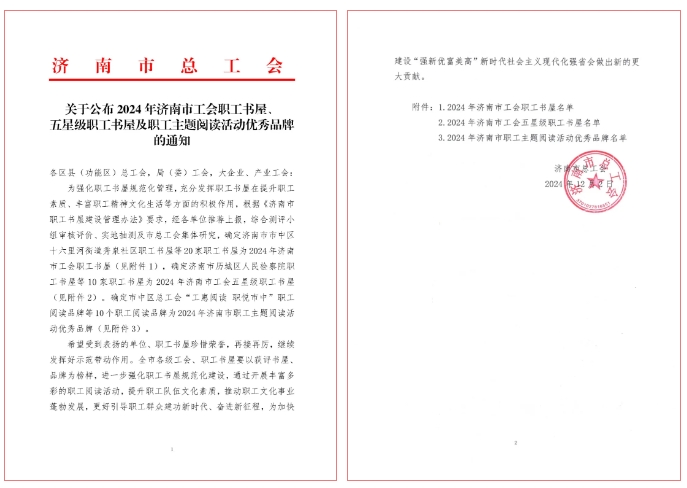 近日,市总工会公布了《关于公布2024 年济南市工会职工书屋、五星级职工书屋及职工主题阅读活动优秀品牌的通知》,m88明昇有限公司职工书屋获评济南市工会五星级职工书屋。