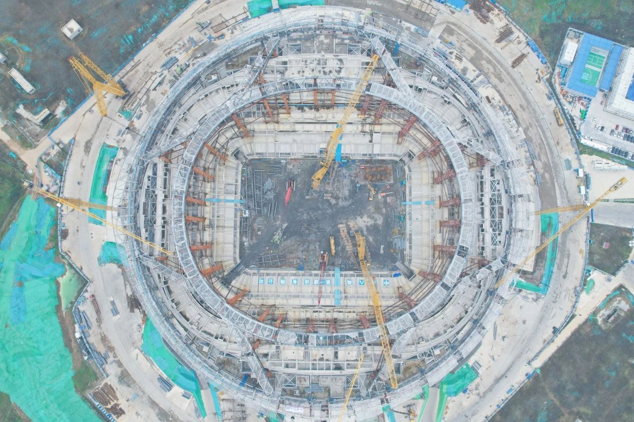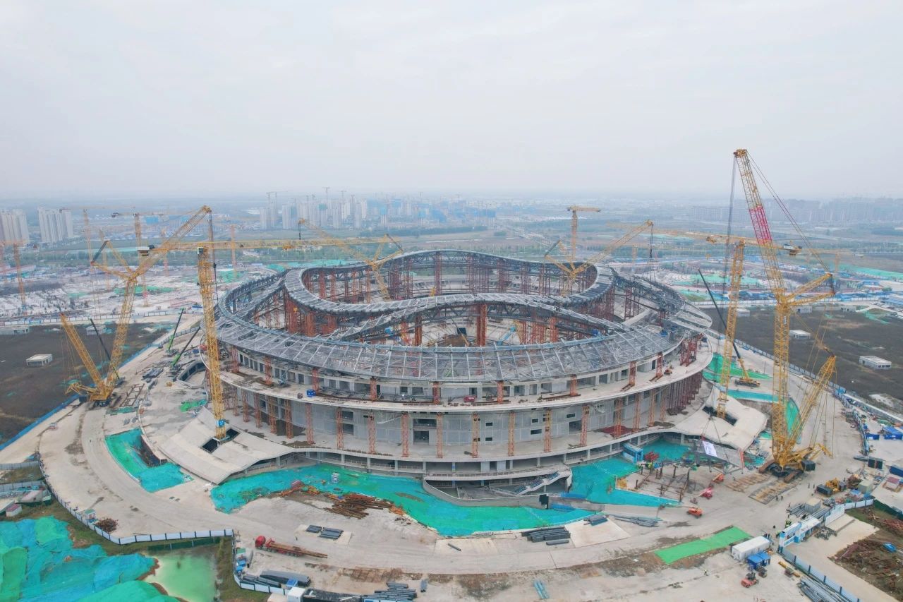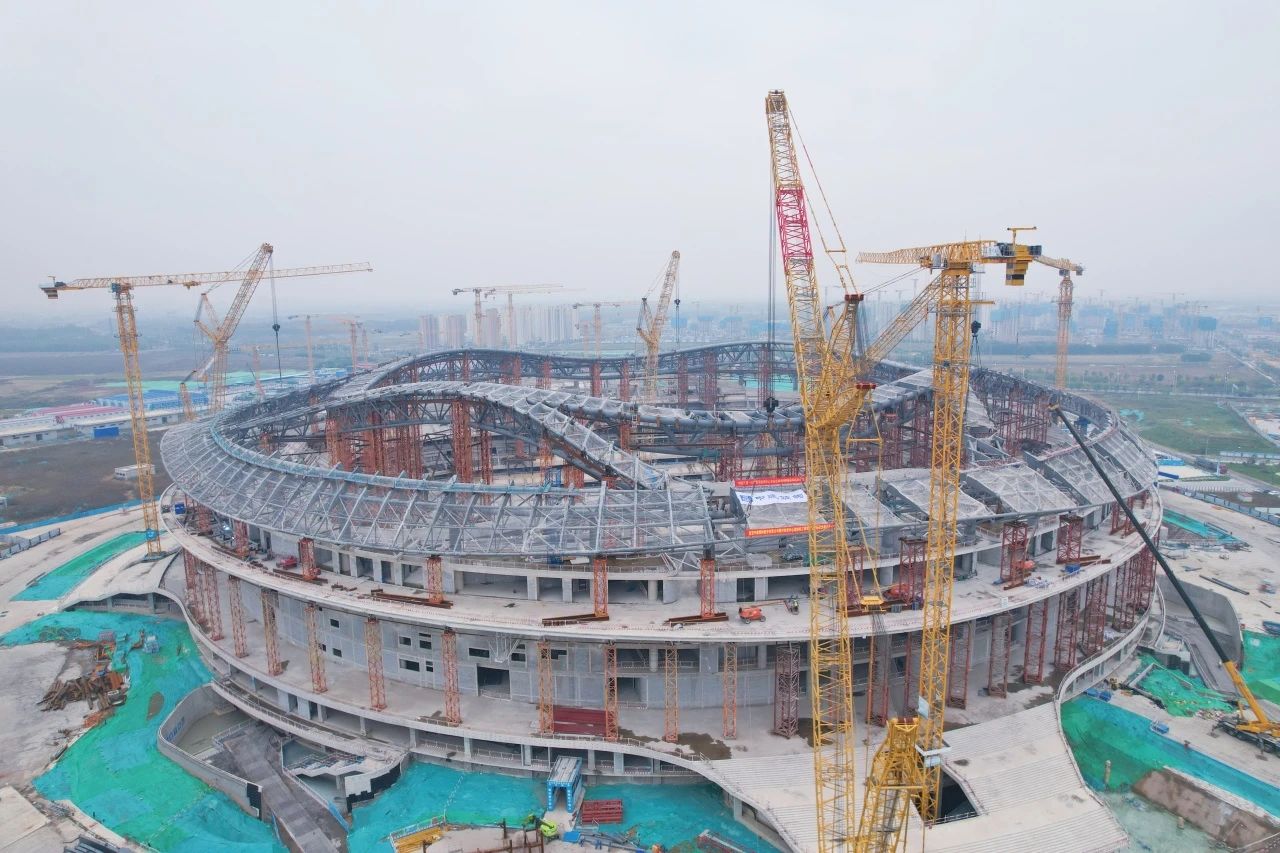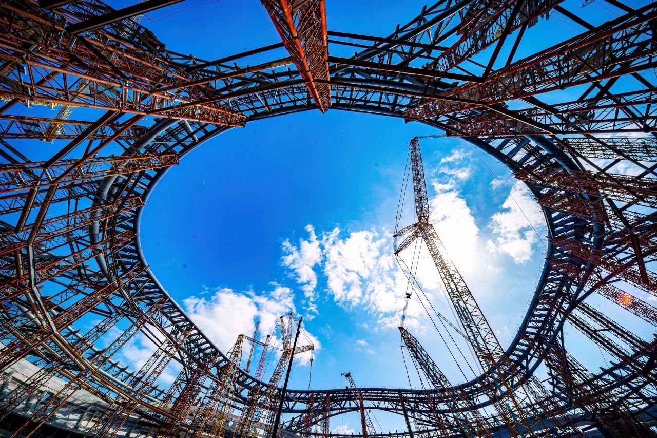 项目钢结构施工拥有多项国内之最,屋盖钢结构最大悬挑长45米,是国内体育场馆悬挑长度之最;施工跨越夏秋冬三季,温度变化会形成巨大误差,累积合龙段施工难度为目前国内之最;钢结构拼装完成后,需要将支撑胎架进行分级卸载,卸载过程中产生的变形量是国内同类场馆之最。