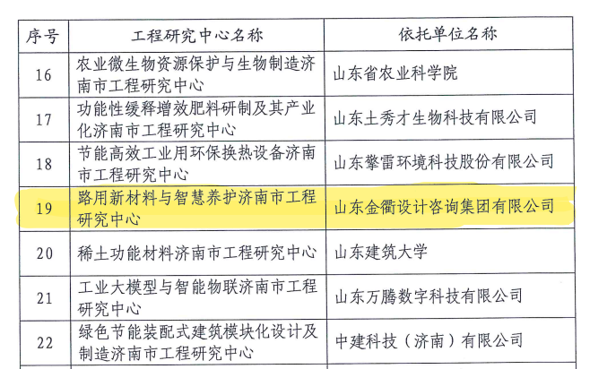 近日,济南市发展和改革委员会下发《关于公布2024年度认定济南市工程研究中心名单的通知》,m88明昇所属山东金衢设计集团有限公司“路用新材料与智慧养护济南市工程研究中心”(以下简称工程研究中心)经严格考察、评审和公示,成功入选,这是2024年金衢集团公司继济南市重点实验室、专家工作站、服务业创新中心后获批的又一科创平台。