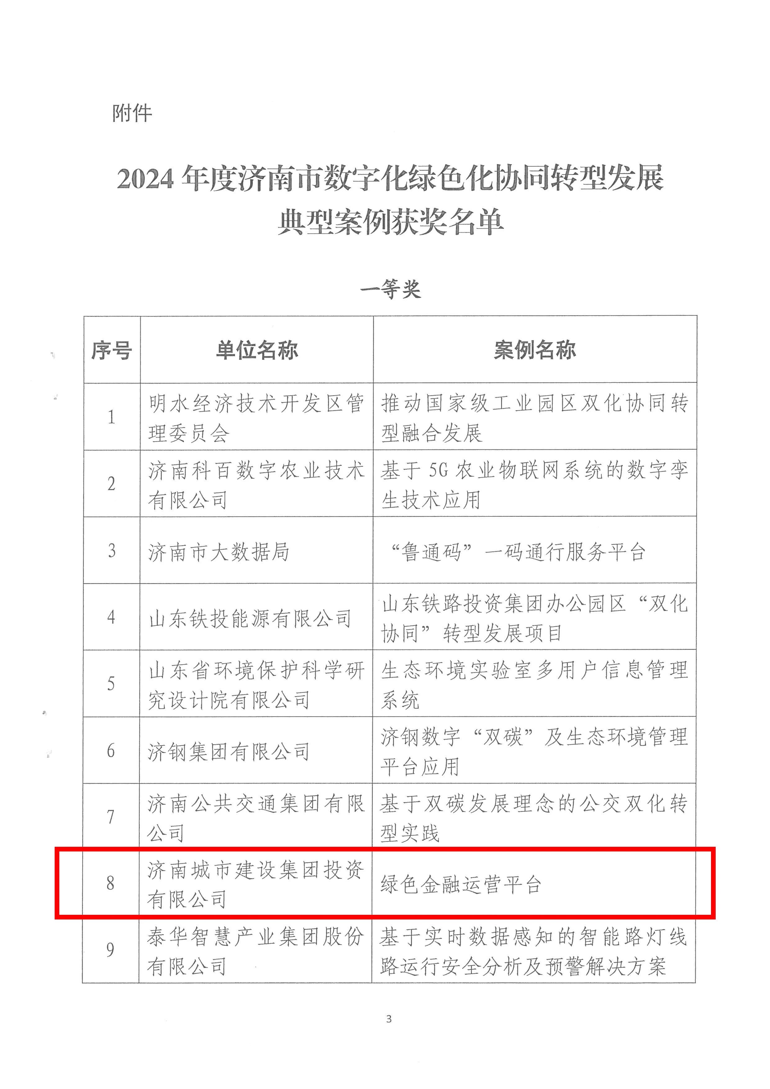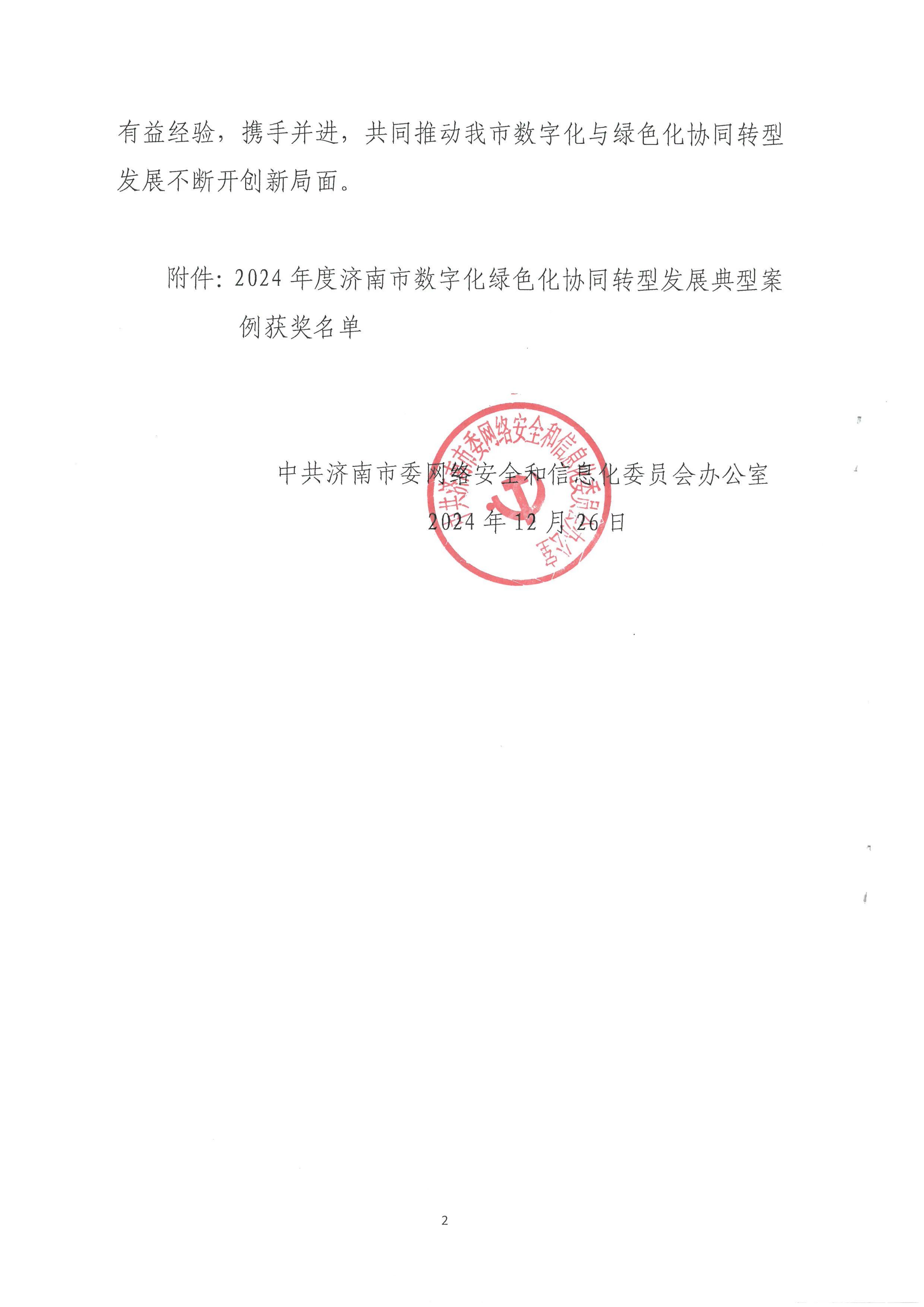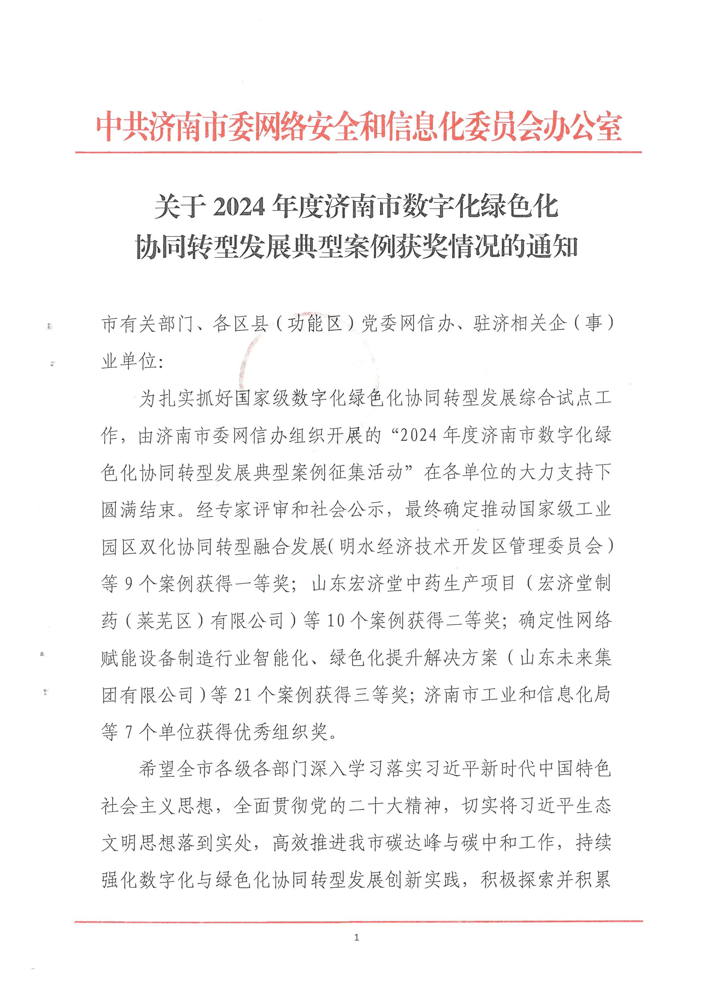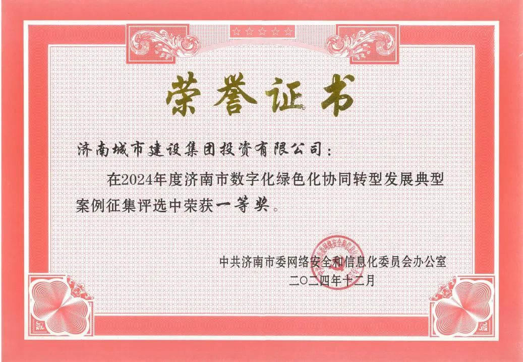 近日,济南市委网信办公布了《2024年度济南市数字化绿色化协同转型发展典型案例获奖情况的通知》。经过严格的考察、评审与公示,m88明昇所属m88明昇投资有限公司提交的“绿色金融协同赋能平台”案例在众多参评项目中脱颖而出,荣获一等奖。