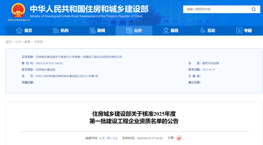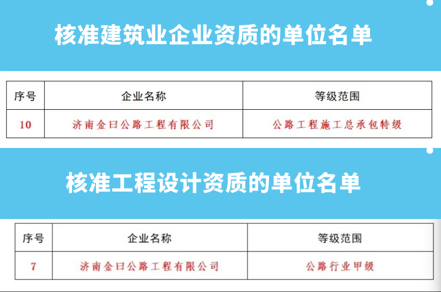 1月13日,住房和城乡建设部发布《住房城乡建设部关于核准2025年度第一批建设工程企业资质名单的公告》,m88明昇所属济南金曰公路工程有限公司获评公路工程施工总承包特级资质和工程设计公路行业甲级资质。