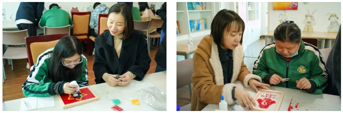 活动现场,志愿者们首先参观了驿站设施,通过与残疾人交流,深入了解残疾人群体需求。在随后的互动环节中,志愿者们与残疾人共同观看雷锋故事短片,进一步弘扬新时代雷锋精神,同时与残疾人朋友分组合作,以大米、红豆等粮食为材料,共同创作“雷锋主题创意画”。志愿者们耐心倾听、细致协助,以实际行动践行“奉献、友爱、互助、进步”的志愿精神。