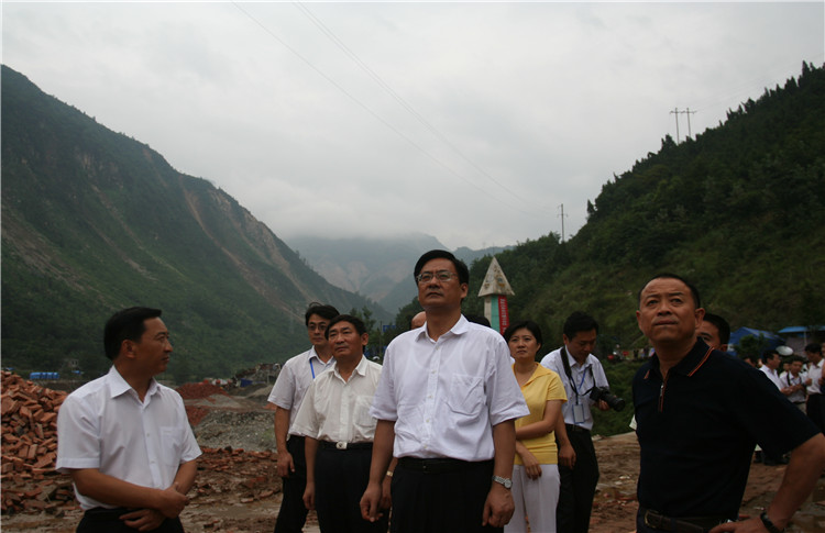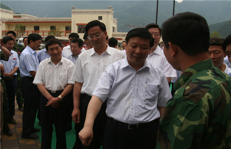 2008年6月,时任山东省委书记、省人大常委会主任姜异康(右一)到擂鼓镇视察抗震救灾工作