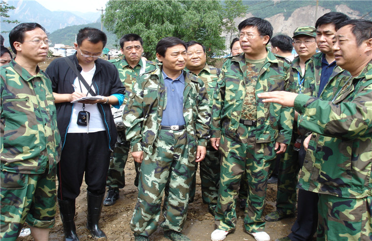2008年6月,时任济南市副市长、市抗震救灾前线指挥部指挥邹世平(中)在擂鼓镇指挥抗震救灾工作