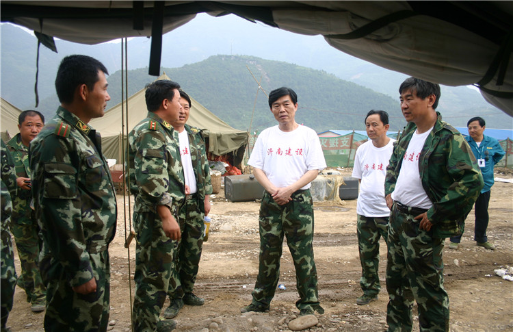 2008年6月,时任济南市副市长、市抗震救灾前线指挥部指挥齐建中(中)在擂鼓镇板房建设现场